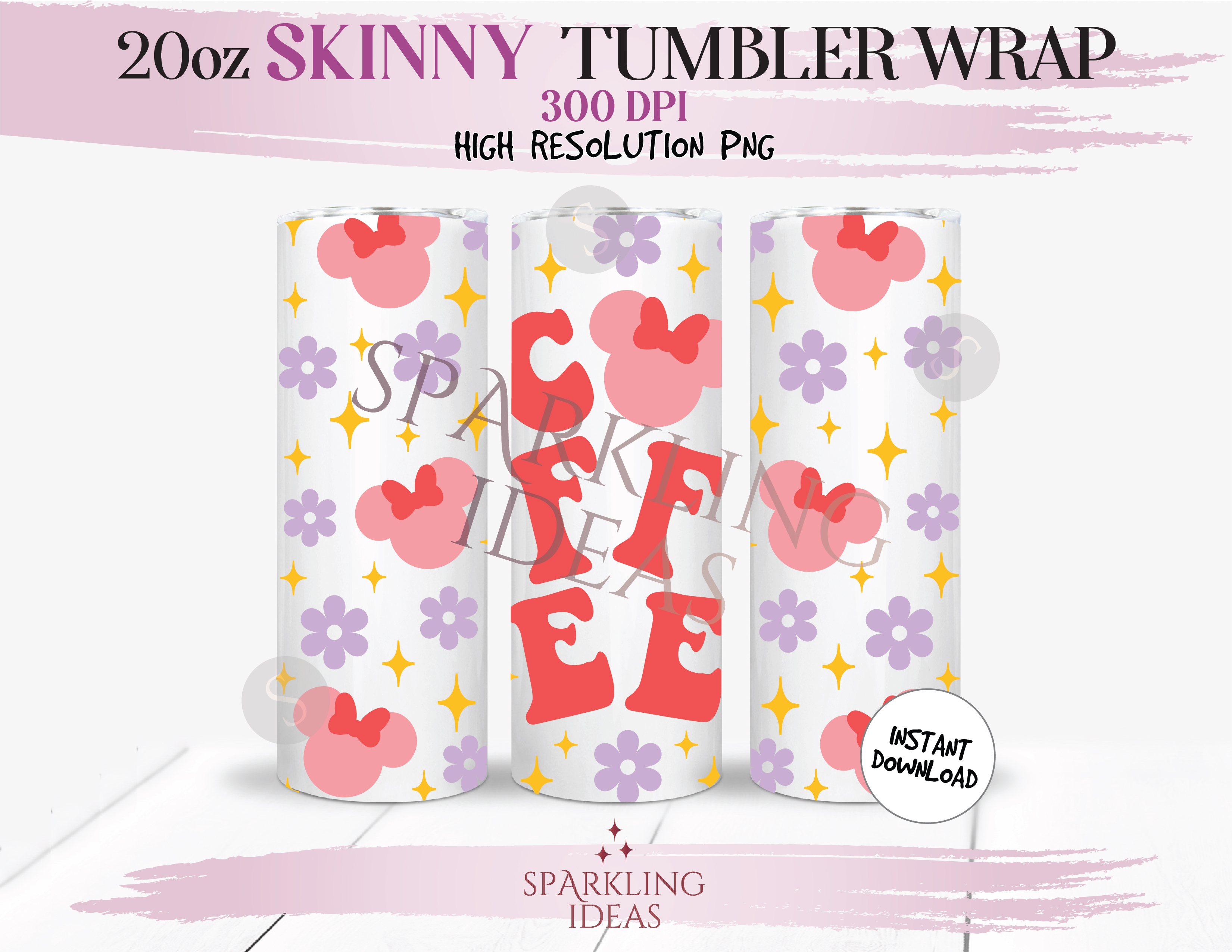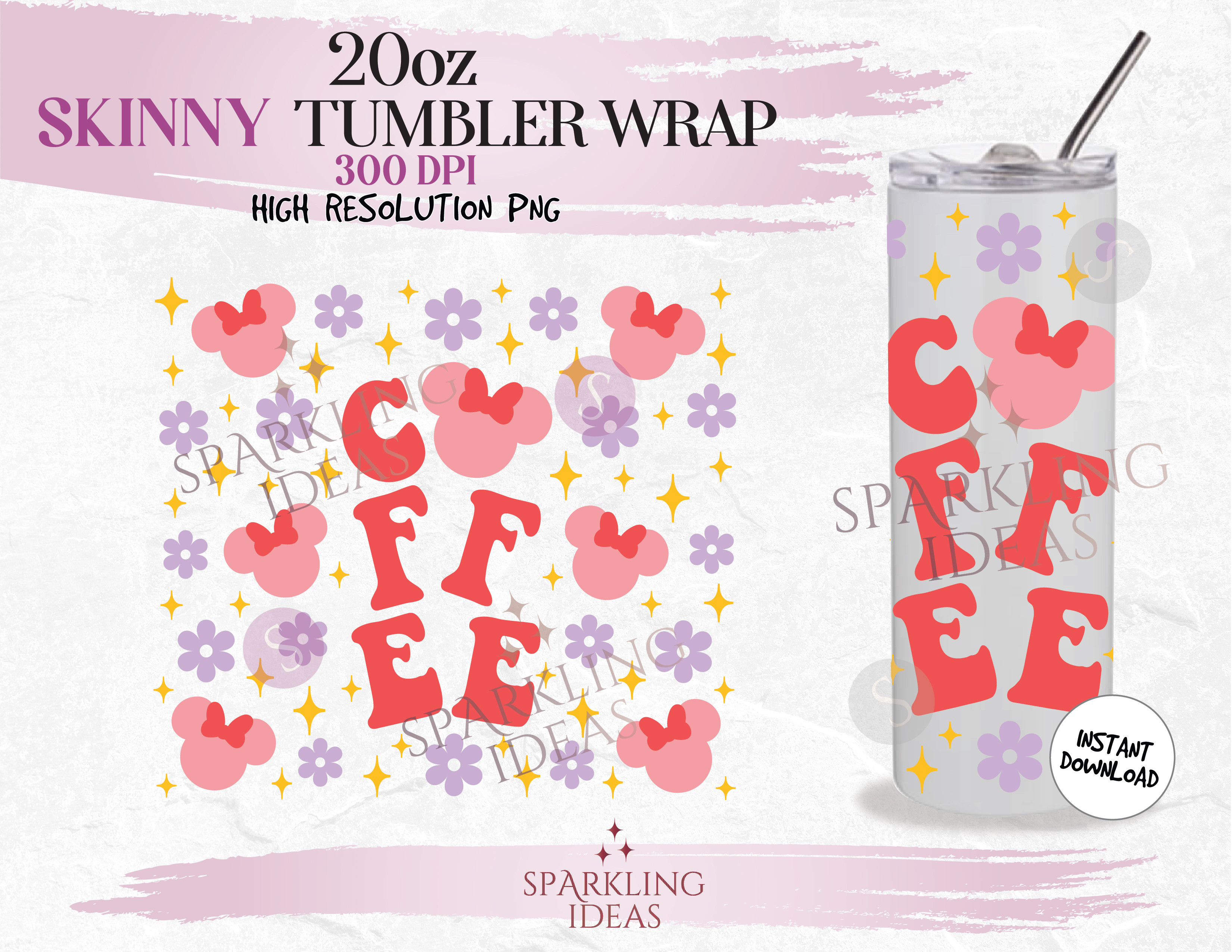20 oz Skinny Tumbler Coffee Retro Minnie Ears Wrap, Retro Letters Tumbler, Magical Coffee Digital PNG Sublimation