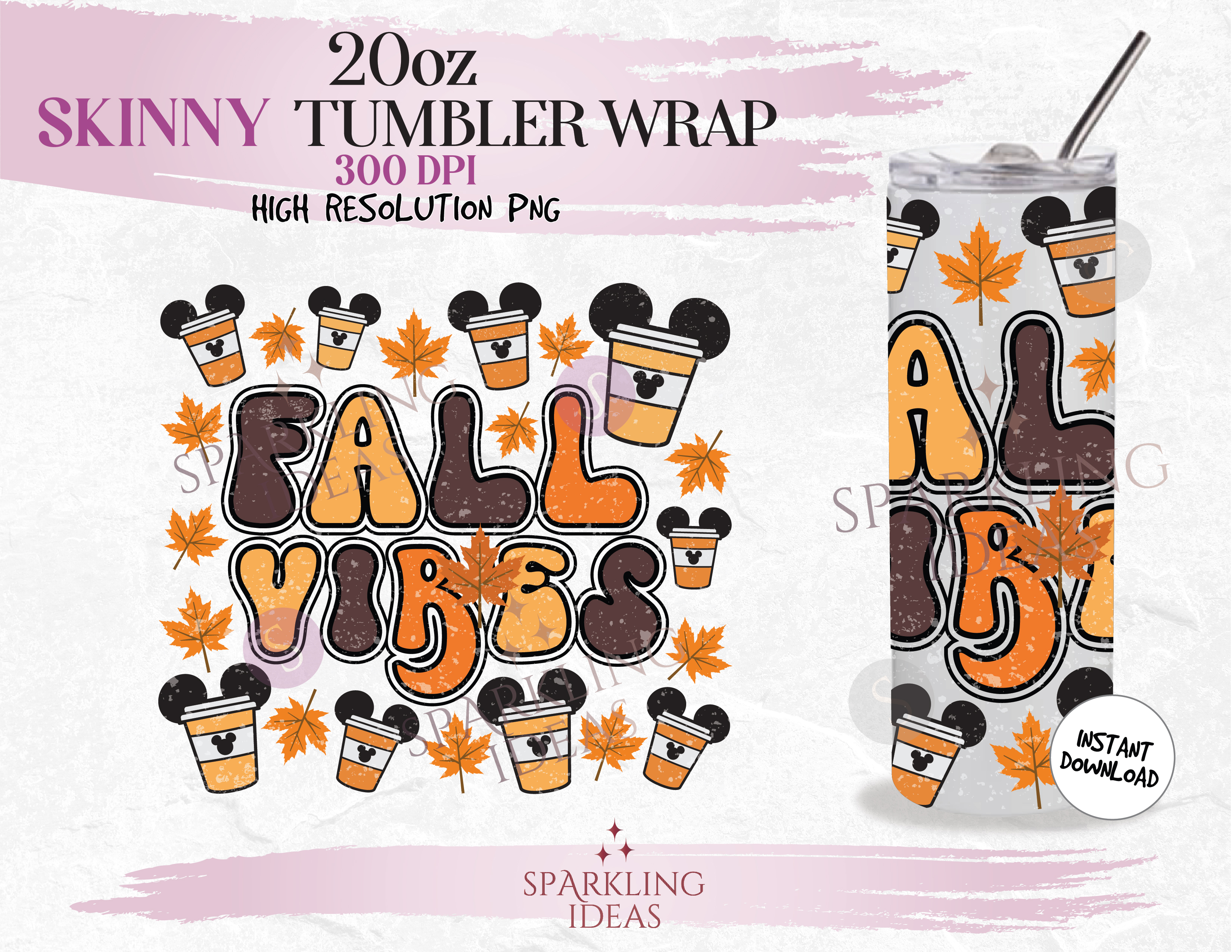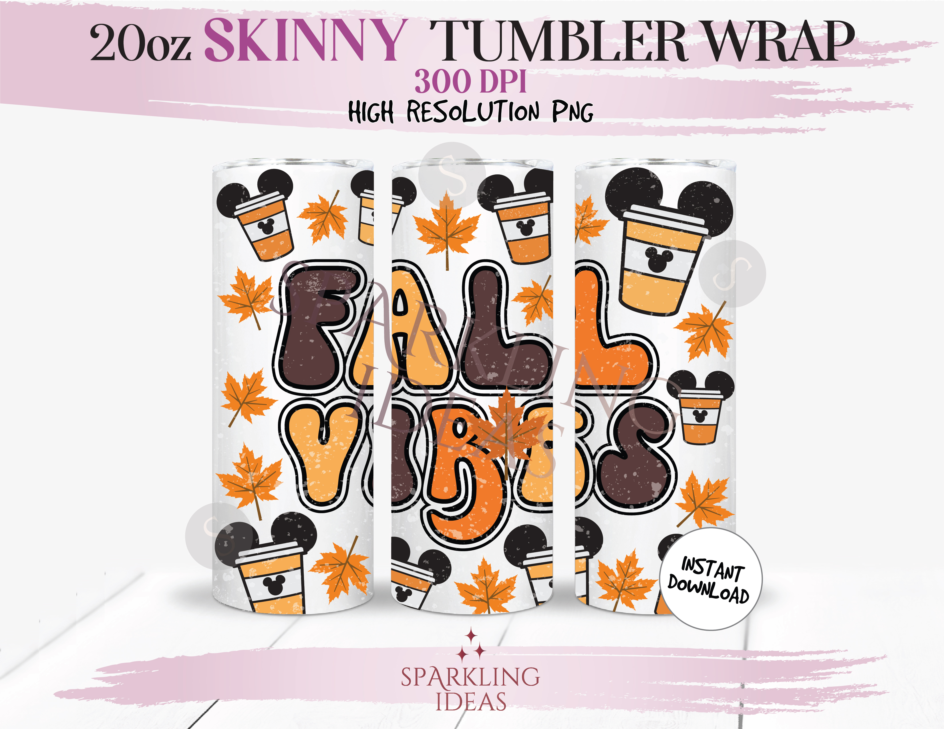 20 oz Skinny Tumbler Fall Vibes Wrap, Fall Coffee Tumbler, Autumn Leaves Mouse Ears Digital PNG Sublimation