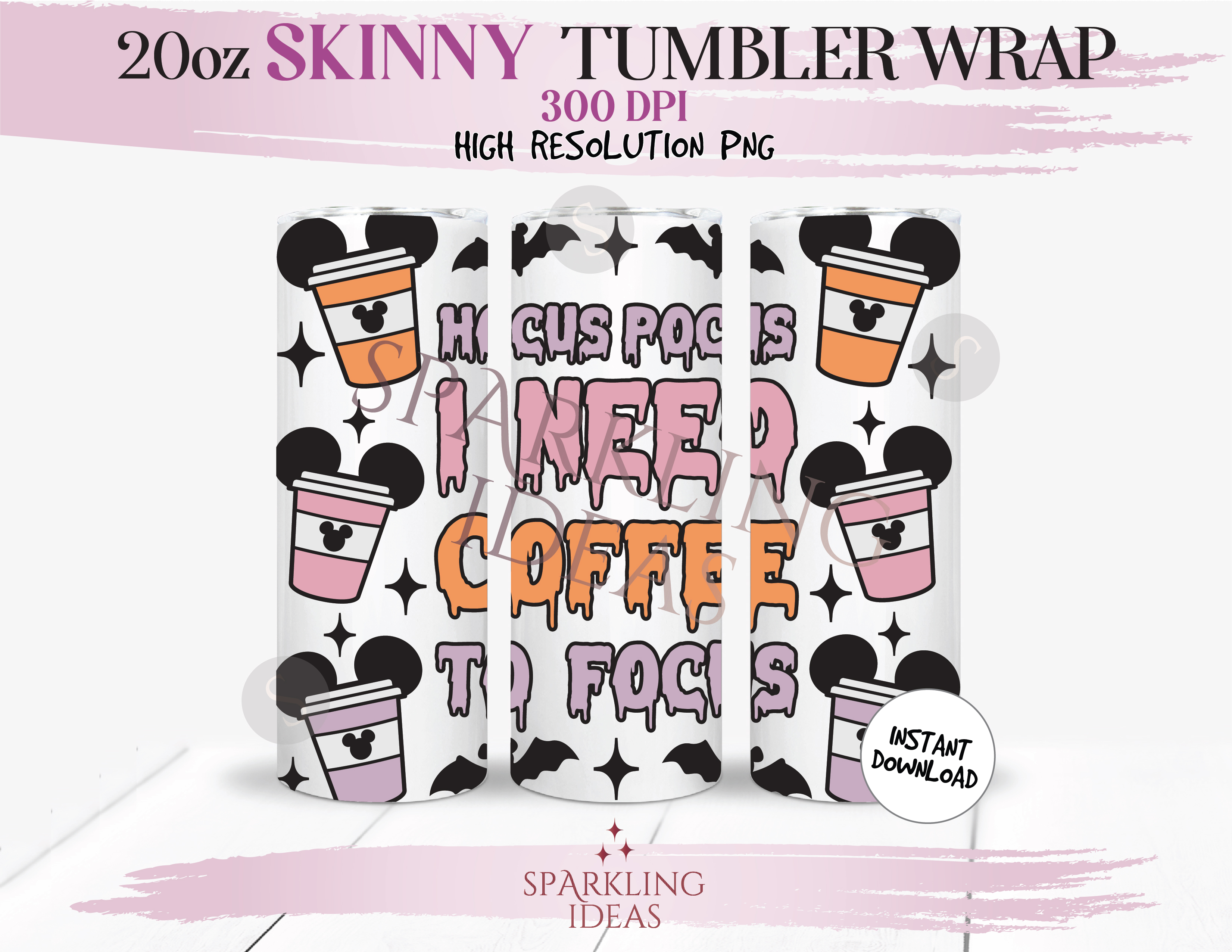 20 oz Skinny Tumbler Hocus Pocus I need Coffee to Focus Wrap, Cute Coffee Halloween Tumbler, Spooky Vibes Digital PNG Sublimation
