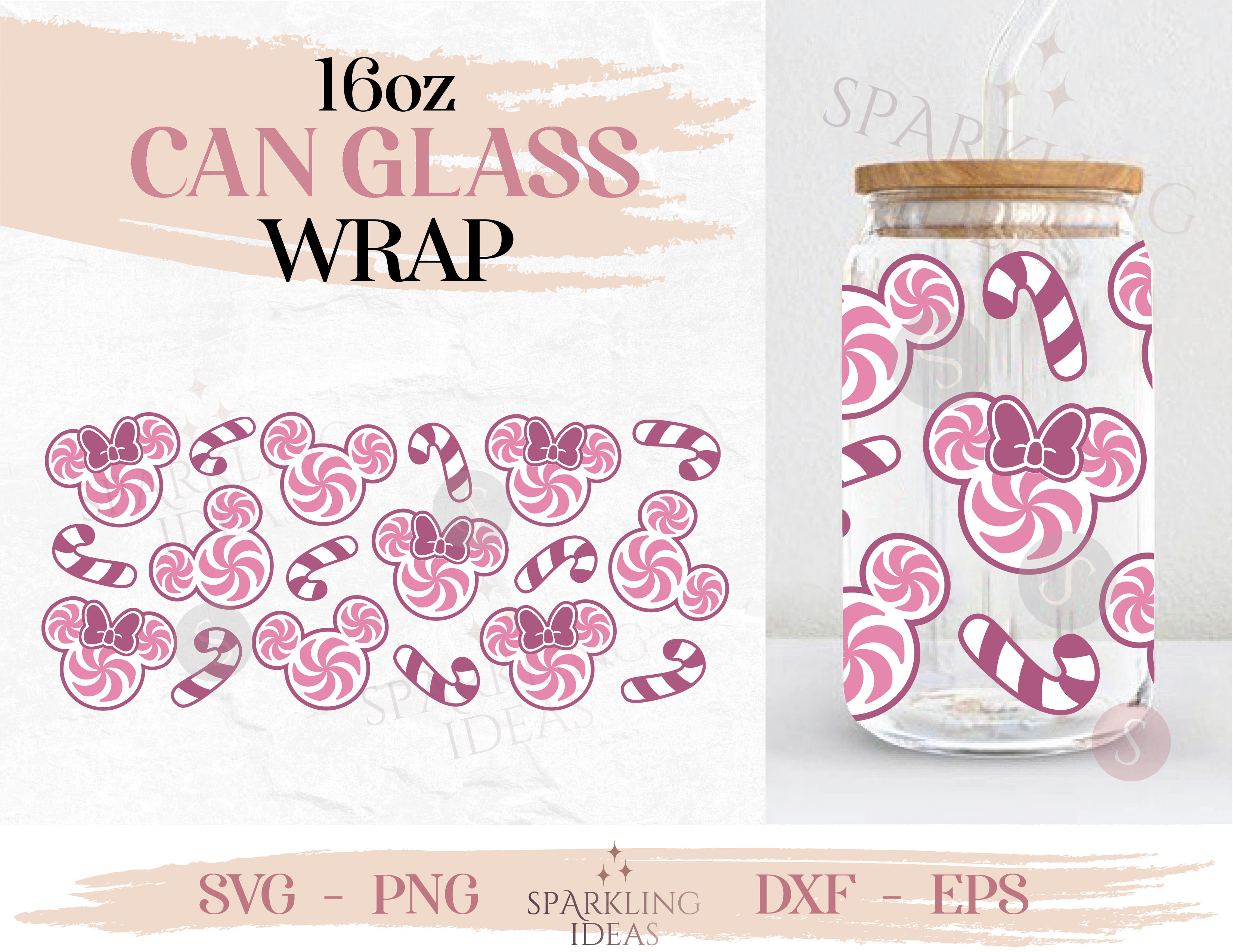 Christmas Candy Ears Pink Can glass wrap SVG 16oz, Pink Christmas Glass Svg, Mouse Christmas Candy Canes Wrap Svg, Pink Mouse Ears Wrap Svg