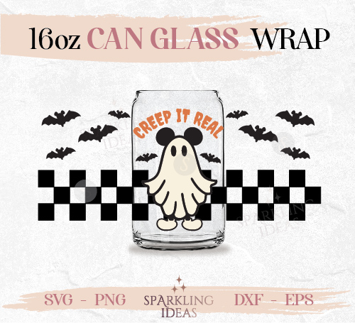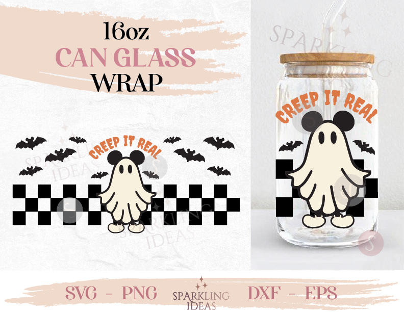 Creep it Real Halloween Can glass SVG 16oz, Mouse Ears Halloween Glass Svg, Mouse Ghost Wrap Svg