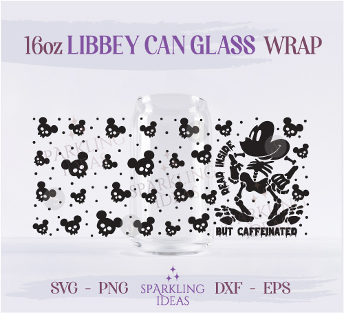 Death inside but Caffeinated 16oz Glass SVG, Mickey Skeleton Libbey Glass Svg, Magical Halloween Wrap Svg