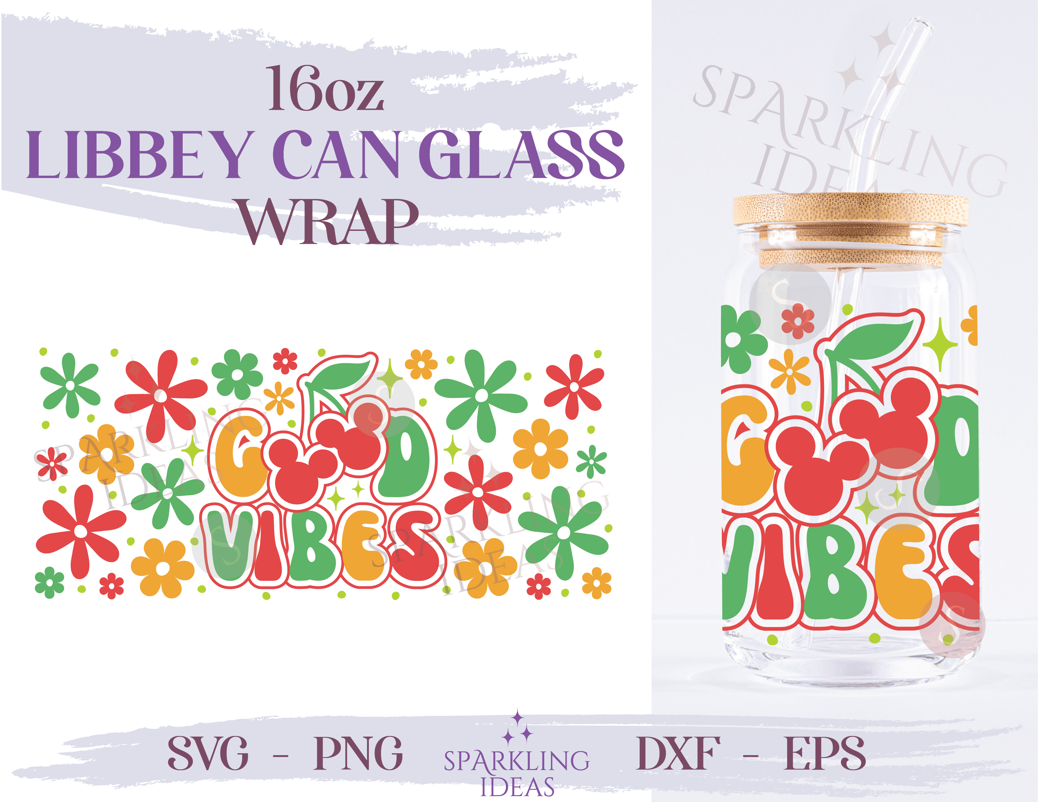 Good Vibes Cherry Mickey Ears Can Glass 16oz, Retro Flowers Mouse Libbey Wrap Svg, Vintage Groovy Mickey Ears Cup Wrap