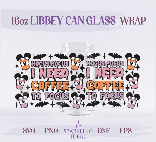 Hocus Pocus I need Coffee to Focus Can Glass 16oz SVG, Cute Mickey Ears Halloween Libbey Glass Svg, Magical Halloween Wrap Svg