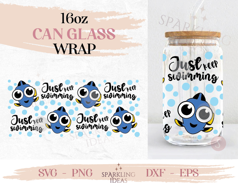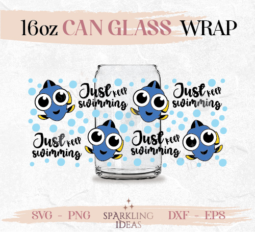 Just keep Swimming Can glass SVG 16oz, Dory Inspired Glass Svg, Finding Dory Inspired Wrap Svg