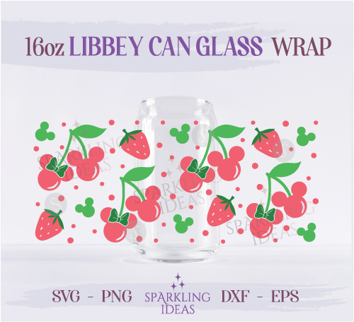 Minnie Cherry and Strawberry Can Glass 16oz SVG, Mouse Fruit Libbey Glass Svg, Fruit Mouse Head Inspired Wrap Svg