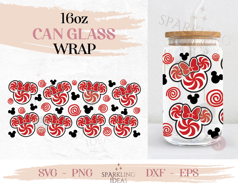 Mouse Girls Christmas Candy Ears Can glass wrap SVG 16oz, Christmas Mouse Bow Glass Svg, Mouse Ears Candy Cane Swirl Wrap Svg