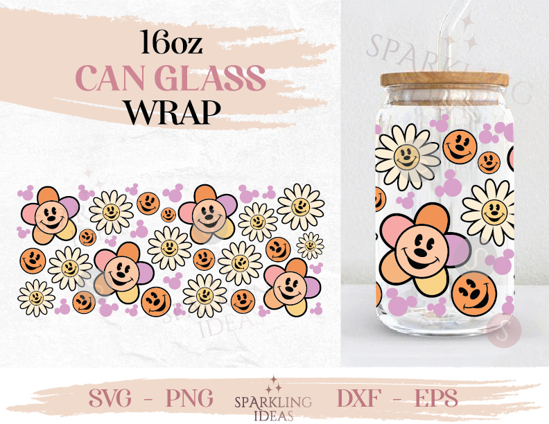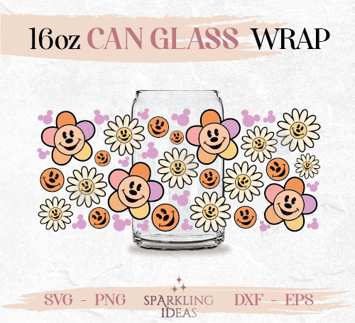 Mouse Groovy Flower Can glass wrap SVG 16oz, Hippie Mouse Ears Can Glass Svg, Happy Face Beer Glass Svg, Flower Smiley Wrap Svg