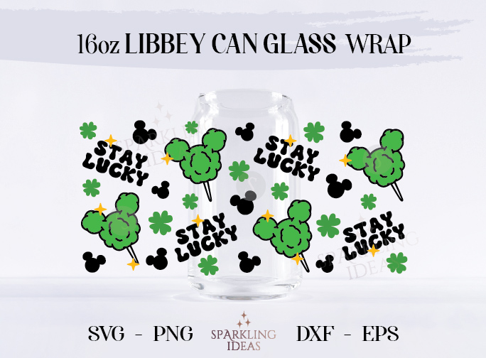 Stay Lucky Can glass wrap SVG 16oz, Patrick’s Day SVG, St Patrick’s Day Cartoon 16oz Libbey Glass Can Wrap Png, Lucky Mouse Coffee 16oz Glass Can Wrap Png
