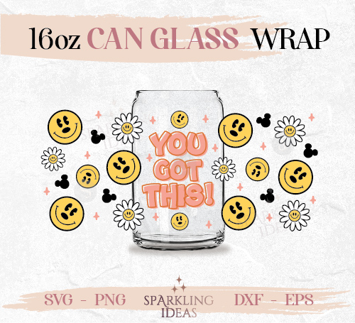 You got this Can glass wrap SVG 16oz, Mouse Ears Happy Face Glass Svg, Mouse Head Wrap Svg, Retro Smiley Flower Svg
